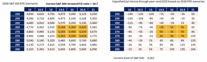 The “Tariff Drag Offsets AI and Productivity Boost to Earnings” table offers scenarios that we believe are reasonable ranges to consider for 2026 earnings, which we use to set year-end 2025 targets for the index, and price-to earnings ratios (P/E). The bolded numbers indicate where we currently believe fair value might be at year end, barring new tariff updates. With the S&P 500 well above its sub-5,000 close on April 8, upside may be more limited, especially if the aforementioned technical resistance levels slightly above 5,500 hold. Higher interest rates will also likely weigh on valuations (more on that later). In other words, the risk-reward is somewhat balanced right now, so we’re not pounding the table to add equities here.