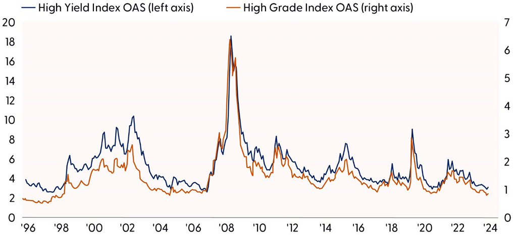 Not Enough High-Yield. The decision to not invest in high-yield bonds was also a miss. High-yield bonds (and loans) were up over 8% on the year and spreads remained relatively contained. We were waiting for spreads to widen to change our recommendation, but that never happened. As highlighted in the chart below, spreads (for both high yield and investment grade) remain at or near secular tights. The last time investment grade spreads were this low was back in 1997 and in 2007 for high yield. Going into 2025, our views on the corporate credit market remain the same — we think the markets are too expensive and aren’t really interested in either market. But unless/until economic conditions deteriorate, spreads will likely stay at these tight levels.
