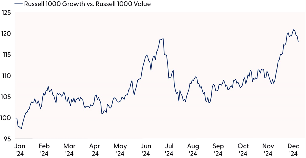 Growth Over Value. This call, which our Strategic and Tactical Asset Allocation Committee (STAAC) maintained all year, was a big winner, with the growth style outperforming its value counterpart by 19 percentage points (33% to 19%) for the year, based on the Russell 1000 style indexes. With prevalent calls for a rotation into more attractively valued value stocks, high expectations for artificial intelligence (AI) investment, and our use of technical analysis kept us in the growth trade throughout 2024.