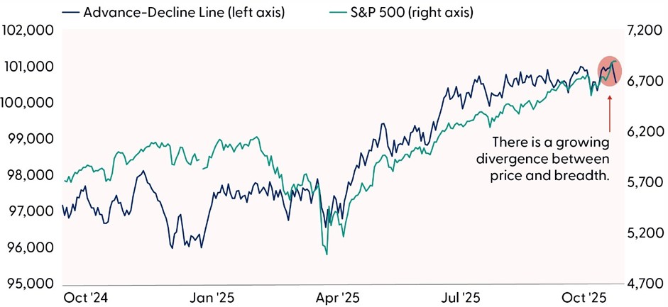 In sum, the macro backdrop is evolving: monetary policy is less predictable, trade risks are easing, and earnings are surprising to the upside. But concentrated leadership and structural cracks in market breadth suggest a more selective and tactical approach may be warranted heading into year-end.