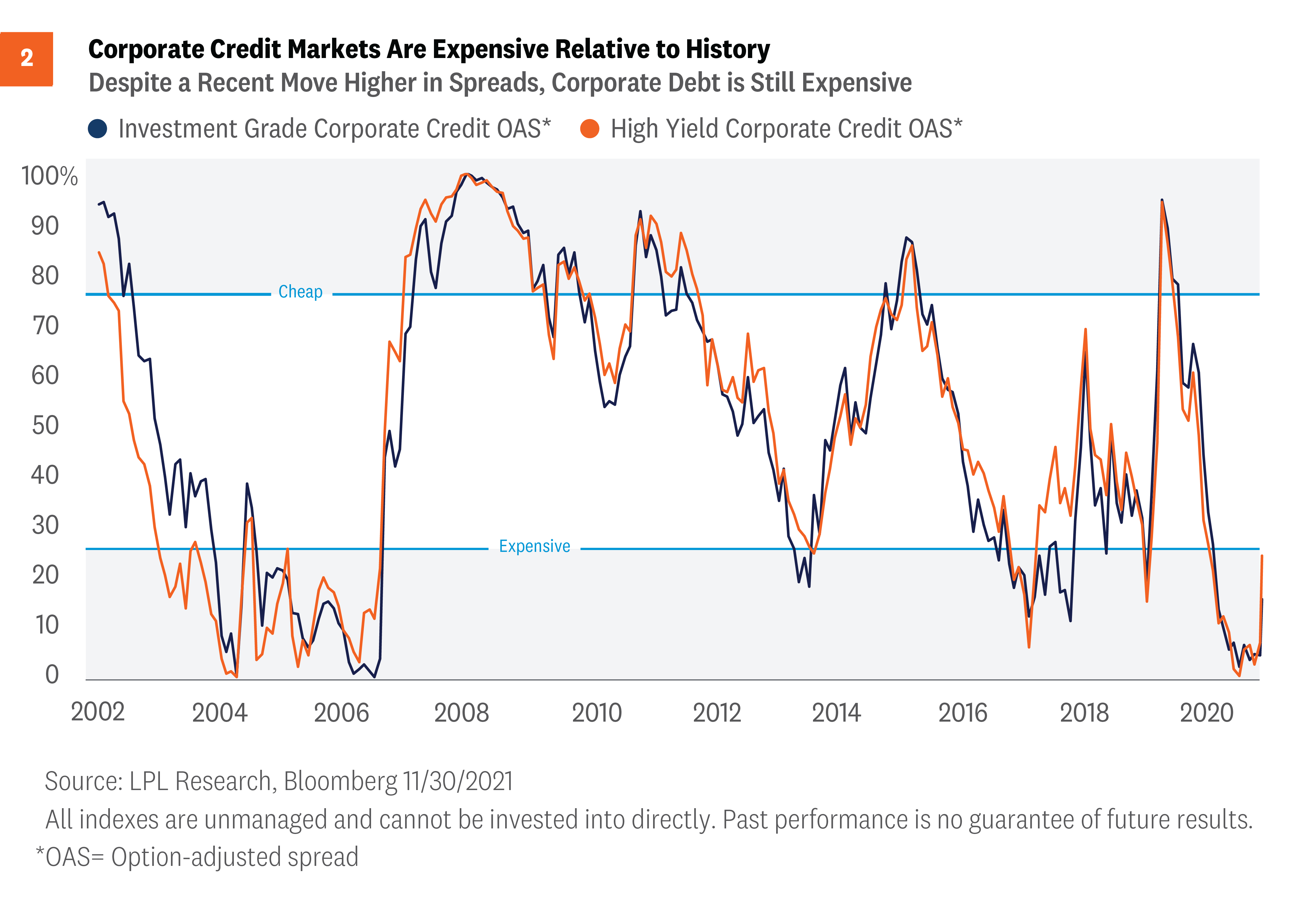 Both investment-grade corporate credit spreads and high-yield credit spreads are in the bottom 25% compared to history, which means valuations have been cheaper 75% of the time over the past 20 years [Figure 2]. Corporate credit markets, both investment grade and high yield, are currently priced near perfection, so any unforeseen event—either related to the economy or at the corporate level—could negatively impact credit markets. We remain neutral on investment-grade corporate credit, but we think equities continue to offer better upside return potential than high-yield bonds, where we remain underweight. For income-oriented investors willing to take on more risk, we think bank loans still make sense, where appropriate.