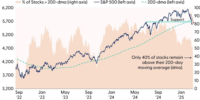 Over the last few weeks, the S&P 500 has suffered an array of technical damage, including a break below the closely watched 200-day moving average (dma) at 5,740 and the July highs near 5,667. These areas now serve as resistance if the market rebounds. Regarding downside risk, key support for the broader market sets up at 5,552, 5,505, and 5,400 (the index closed at 5,639 on March 14). These levels could be tested if market breadth on the index continues to deteriorate. As of last week, only 40% of S&P 500 constituents were trading above their 200-dma, marking the lowest reading since November 2023. While Friday’s broad-based relief rally was a step in the right direction, a reading of at least 50% would be required to push this breadth indicator back into bullish territory.