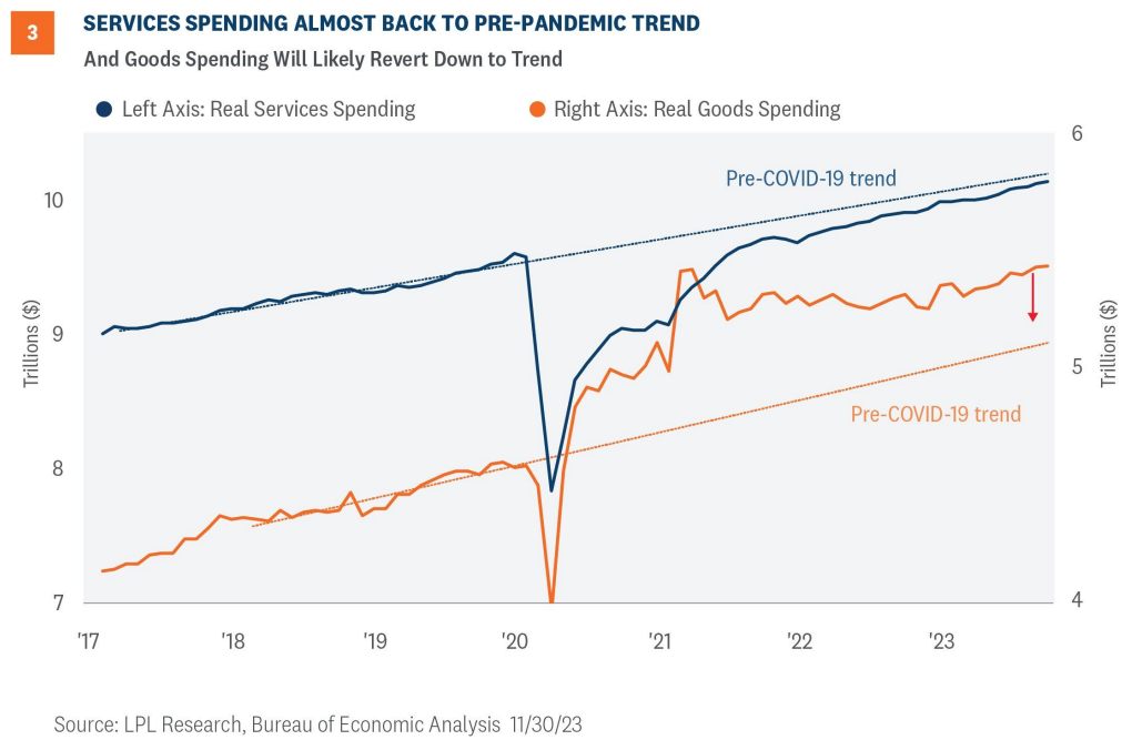 If consumers return to normal spending patterns, we should see a modest deceleration in the rate of spending as consumers recalibrate. Investors should watch the consumer discretionary space as shoppers rotate the composition of spending.
