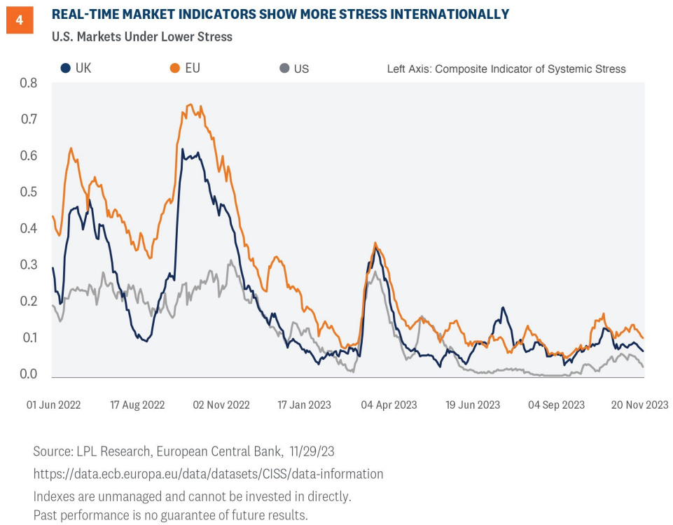 One additional item to watch is the U.S. dollar. As the Fed started to sound less hawkish, investors saw a decline in the dollar. A weaker dollar is often good for emerging markets, potentially providing an opportunity in the near future. LPL Research currently holds a negative view of emerging market equities but acknowledges valuations are attractive and that certain markets such as India and Brazil are intriguing. Domestic markets are relatively more attractive given the lower stress, but the improvement in real-time market stress indicators bodes well for long term investors.1 As indicated in Figure 4, the U.S. markets have less financial stress than the E.U. or the U.K., but that is typical given the historical data. This indicator from the European Central Bank (ECB) is insightful as investors gauge financial conditions across countries.